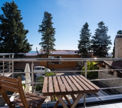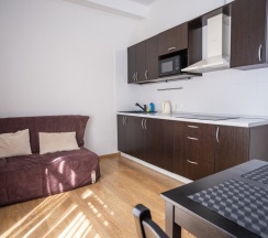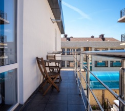 2-й этаж, балкон, вид в сторону моря. Апартамент укомплектован всей необходимой кухонной утварью, включая варочную панель, микроволновую печь, стиральную машину.
