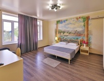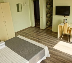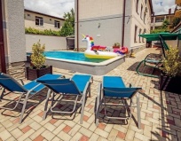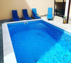 Разместили быстро. Хорошие хозяева. Уютные номера. Кондёр, холодильник, чайник в номере. Бассейн и мангальная зона. Кухня. В общем отличное место, в центре города. Не далеко от пляжа.