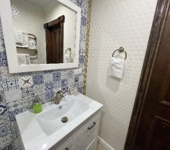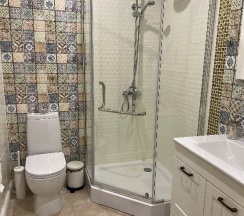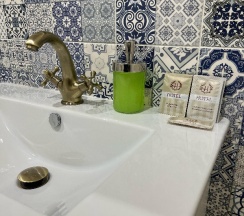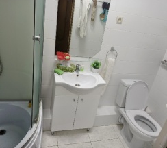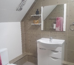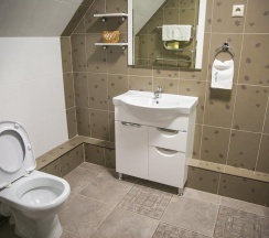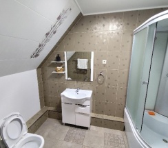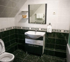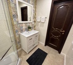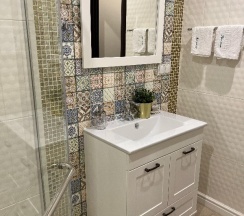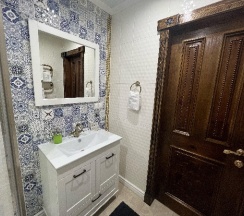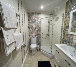Ванная комната чистая и производит приятное впечатление. В гостинице имеется целая кухня, где можно готовить при желании или разогревать купленную еду. Сама гостиница в шаговой доступности от жд вокзала, но во дворах, так что нет шума от поездов и иного транспорта. Персонал вежливый и отзывчивый. Рекомендую.