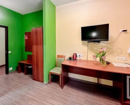 Номер для комфортного проживания одного Гостя. В номере удобная односпальная кровать, письменный стол, телевизор, холодильник, фен, тапочки. В ванной комнате душевая кабина.