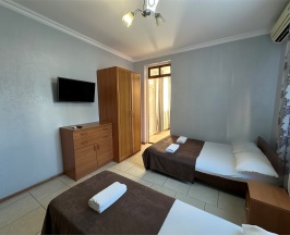 Просторный четырехместный номер с двумя двуспальными кроватями. Для удобства гостей в номере имеется санузел, душ, холодильник, телевизор, чайник, кондиционер, чайный набор посуды.