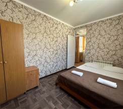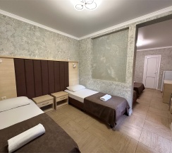 Двухкомнатный номер для большой семьи или компании друзей. В номере имеются две двуспальные кровати и односпальная кровать. Так же в комплектации номера предусмотрен душ, туалет, холодильник, телевизор, чайник, кондиционер, чайный набор посуды.