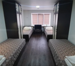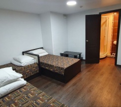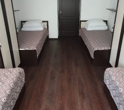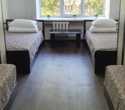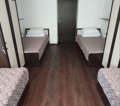 Просторный четырехместный номер с четырьмя односпальными кроватями с ортопедическими матрасами. Отдельное освещение над каждой кроватью с полкой и индивидуальный для каждого гостя шкаф, запираемый на замок.