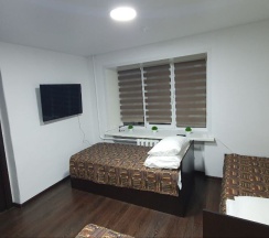 Благоустроенный просторный номер с тремя односпальными кроватями с ортопедическими матрасами. Дополнительно в номере шкаф, телевизор и отдельный санузел.