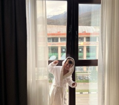 Спа-Отель находится в центре Эсто-Садка. Были с супругой три дня в октябре. Нам предложили замечательный номер с видом на горы за что очень благодарны. Завтраки очень вкусные и с шампанским. Спа процедуры на высшем уровне, джакузи супер. Приветливый персонал, ежедневная уборка номера. Нам все понравилось.