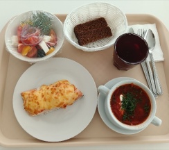 Жить мы тут не жили, размещались рядом, но не раз заходили заходили покушать в столовую. Столовая очень хороша, есть выбор и цены приятные.
