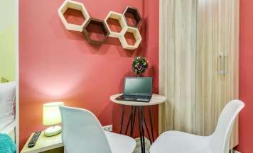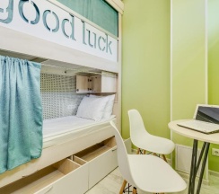 Чистота, яркость, простор, возможность позднего заселения, есть некоторые средства гигиены (мыло, гель для душа, шампунь), фен… Расположен в соседстве с кафе, где можно купить кофе с пирожным.