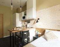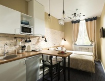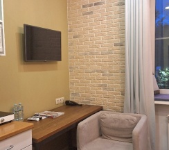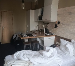 Отличное расположение, очень доброжелательный персонал на ресепшен, всегда готовый помочь, номер соответствует описанию - отличный дизайн, есть СВЧ, мойка, набор посуды, плитка, холодильник. Прекрасный матрас, 4 подушки на одного - очень круто. Чисто, не холодно и не жарко. Рядом всегда можно припарковать авто. Окна выходят на одну из центральных улиц - вечером и ночью шумно при открытом окне. Завтрак приносят из доставки - не очень вкусно, но и заказывать необязательно. Кофе из аппарата внизу - хороший.