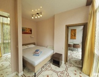 Останавливаемся в этих апартаментах уже 3 год . Номер называется на сайте полулюкс с 2 комнатами . Отличная домашняя обстановка . Мы с маленькими детьми и с собакой ( можно что не везде) . Кухня большая с плитой , посудомойкой и даже есть кофемашина с капсулами. Отдыхать длительно очень удобно . Милая женщина убирается через день . Все магазины рядом . Др набережной совсем близко.