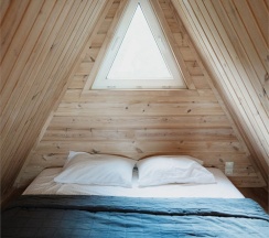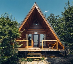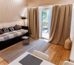 Alfa suite — это двухуровневый дом площадью 45 м², состоящий из одной спальни, кухни-гостиной, санузла с душевой кабиной и просторной террасы.
