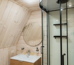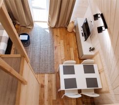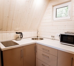 На первом уровне находится: совмещенный санузел с душевой кабиной и кухня-гостиная. Кухня оборудована холодильником, варочной поверхностью, микроволновой печью и электрическим чайником. Раскладной диван в гостиной можно использовать, как полноценное спальное место.