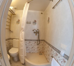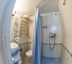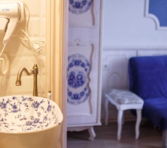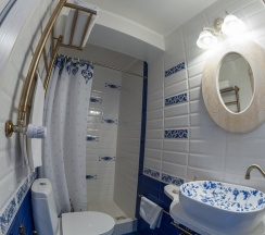 Отель понравился. Была комната в стиле гжель, приятная обстановка. Кровать расположена на 2м уровне, подниматься по лесенке, меня это не смутило. Белье и сам были чистые. Понравился санузел, люблю такой стиль под старину. Заселение было поздним вечером, безконтактное, тоже все понятно, проблем не возникло. Есть кухня, посуда и принадлежности имеются в достатке.