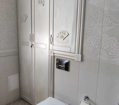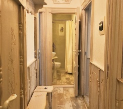 Душ в ванной комнате замечатальный, вода уходит, засоров в канализации нет. Плитка не дешевая, дизайнерский ремонт, интересные двери!