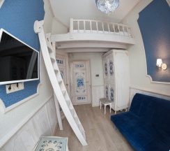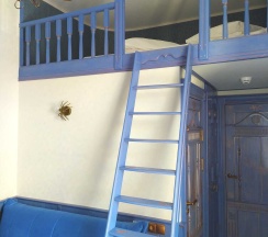 Номер рассчитан на 2-х человек. Основное спальное место - двуспальный матрас - расположено на кровати-чердаке, куда необходимо подниматься по небольшой лестнице. Если гости испытывают затруднение с этим, они могут разместиться на раскладном диване.
