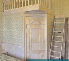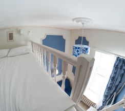 Номер рассчитан максимум на четырех человек. Основное спальное место представлено в двух модификациях: одна двуспальная кровать или две односпальные кровати. Дополнительное спальное место - двуспальный матрас - расположено на кровати-чердаке, куда необходимо подниматься по небольшой лестнице.