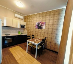 Кухня-столовая: кухня (холодильник, микроволновая печь, кухонная мебель, духовой шкаф с грилем, электрический чайник, кухонные принадлежности и посуда, ножи и пр. кухонные инструменты, электрическая плита со стеклокерамической варочной поверхностью, кухонная вытяжка, посуда, столовые приборы, моющие средства, кухонное полотенце, кухонная мойка), обеденные мягкие стулья и стол, телевизор, кондиционер, отопление, плиточный пол;