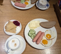 По еде. Жили 5 дней и одно и тоже меню. Одни изменение было ,это дали слойку и ФсЕ. Еда вроде стоит на специальных подогреваемых плитах ,но все ровно холодная. Ну ещё кофе не самый вкусный, но норм.