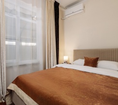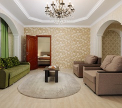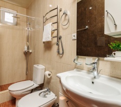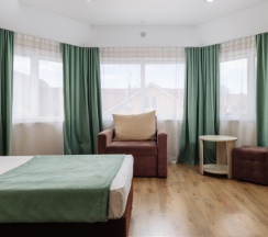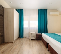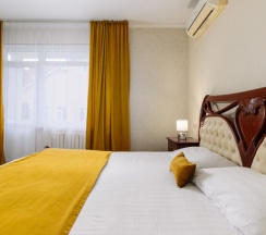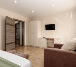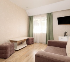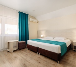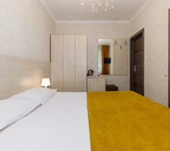 Комфортный и уютный номер, вместимостью до 4 гостей . Для Вашего удобства в номере имеются: одна двуспальная и одна односпальная кровать + кресло-кровать для 1 гостя, набор полотенец и постельного белья, телевизор, журнальный столик, электрический чайник, посуда для чая и сока, фен, кондиционер, холодильник. В собственной ванной комнате есть душ, бесплатные туалетно-косметические принадлежности. На балконе имеется сушилка для белья. Эксклюзивный дизайн интерьера сочетает в себе спокойные и благородные тона. Номера расположены на 2,3,4 этажах.