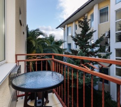 Окна выходят на наш уютный, красивый, благоустроенный двор с шикарными пальмами, зеленой живой изгородью и яркими цветами. Бесплатный Wi-Fi. Свой балкон. Номер находится на втором этаже.