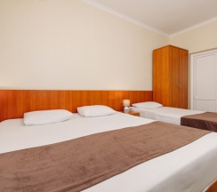 Комфортный , светлый номер , в котором могут разместиться 3-е человек. Установлена одна двуспальная и одна односпальная кровати. Номер данной категории имеет общий балкон, выйдя на который можно любоваться красотой нашего двора с шикарными, живописными пальмами. Оснащение всем необходимым для Вашего комфортного пребывания: телевизор, шкаф для одежды, тумба, кондиционер, фен, холодильник, чайные принадлежности. Совмещённый сан.узел с душевой со всеми необходимыми косметическими принадлежностями. Бесплатный WiFi. Номера расположены на 2,3 этажах.