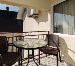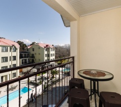 Уютный комфортабельный 2-х комнатный номер, вместимостью до 6 гостей. Для Вашего удобства в номере имеются: в спальной комнате одна двуспальная кровать, кресло-кровать . В гостиной диван-кровать для 2 гостей + кресло-кровать для 1 гостя. Набор полотенец и постельного белья, журнальный столик, электрический чайник, посуда для чая и сока, фен, кондиционер, холодильник, телевизор в каждой комнате. В ванной комнате есть душевая, бесплатные туалетно-косметические принадлежности. Просторный, уютный и солнечный балкон, с которого можно любоваться красотой нашего двора с шикарными, живописными пальмами. Номера расположены на 3,4 этажах.