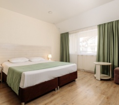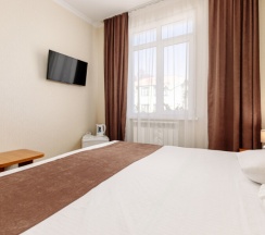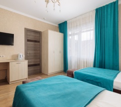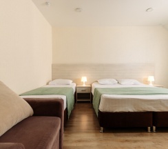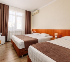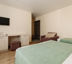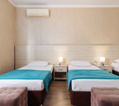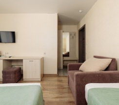 Комфортный номер до 3 гостей . Для Вашего удобства в номере имеются: две односпальные кровати, софа или кресло-кровать для 1 гостя, набор полотенец и постельного белья, телевизор, журнальный столик, электрический чайник, посуда для чая и сока, фен, кондиционер, холодильник. В собственной ванной комнате есть душ, бесплатные туалетно-косметические принадлежности. Номера находятся на 2,3 этажах.