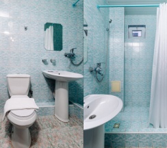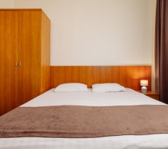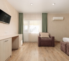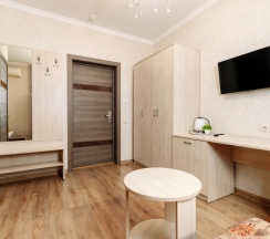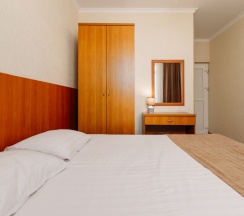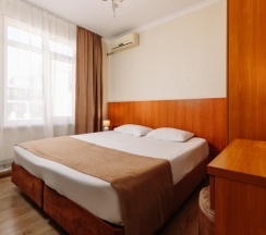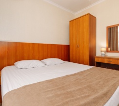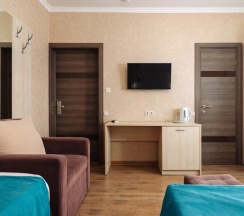 Комфортный и уютный номер , в котором с легкостью смогут разместиться 3 человека. Для третьего гостя предусмотрено дополнительное место, в виде раскладного кресла. Номер оснащен всем необходимым для Вашего комфортного пребывания: телевизор, шкаф для одежды, тумба, кондиционер, холодильник, фен, чайные принадлежности. Совмещённый сан.узел, с душевой оснащён всеми необходимыми косметическими принадлежностями.