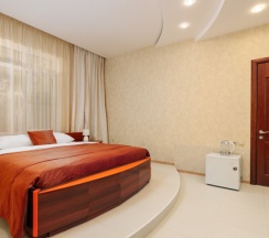 Полулюкс — это уютный номер с дизайнерской подсветкой потолка, с шикарной кроватью King Size и джакузи, предназначенный для двоих гостей. В номере есть телевизор и кондиционер,холодильник Ванная комната оборудована джакузи, сан.узлом, феном и всеми необходимыми косметическими принадлежностями. Бесплатный WiFi.