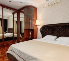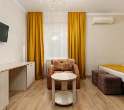 Шикарный номер в классическом стиле с кроватью King Size, великолепно подойдет для двоих гостей. В номере есть телевизор и кондиционер, сейф,холодильник В ванной комнате есть душевая, сан.узел, беде, фен и все необходимые косметические принадлежности. Полулюкс расположен на первом этаже и выходит во внутренний двор с зелёной изгородью и яркими цветами. Бесплатный WiFi.