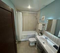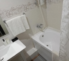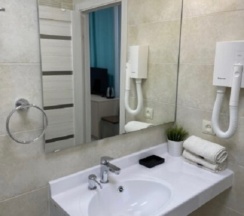 Ванна-туалет совмещенные, но удобно, не тесно. В ванной два уровня крепления душа по росту - для взрослых и детей. Верхнее крепление вылетает, дюбеля закрепите, пожалуйста. Фен Valera слабоват, долго сушиться.