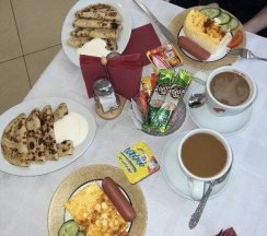 Завтрак включён в стоимость, но лучше без него. Спрашивают, во сколько придём на завтрак сразу при заселении, интервал с 7 до 10 нужно выбрать. Но нам не повезло, с нами в зале ели тётки 50+ прям в уличной одежде, переговариваясь сразу через всё столики, как в колхозе. А потом группа приехала на заселение, и прям в тёплой одежде их экскурсовод привела в зал побухать шампусика за приезд. Ничего конечно, но нормы хоть какие-то должны соблюдаться.