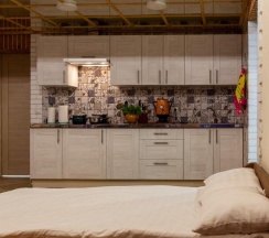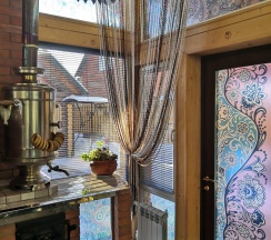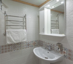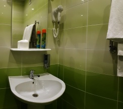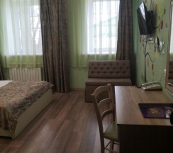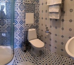В комнате: семейная кровать с прикроватными тумбочками, стол со стулом, ТВ, телефон, зеркало и вешалка. Большая отапливаемая застекленная лоджия, на которой расположена комфортная раскладная диван-кровать и открывается шикарный вид на Покровский монастырь. Санузел: душевая кабина, фен, унитаз с функцией биде.