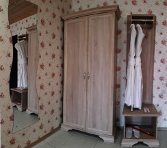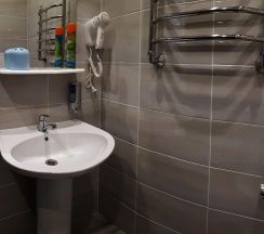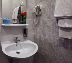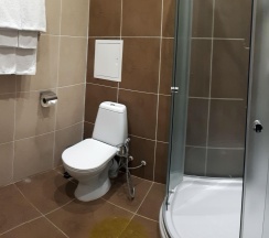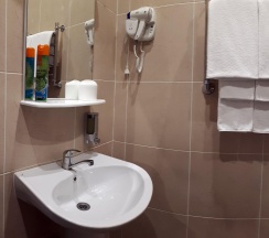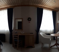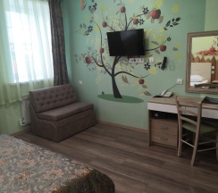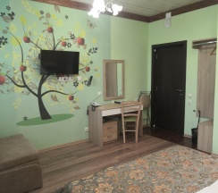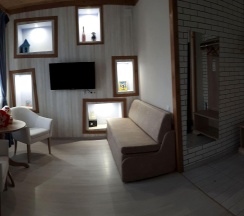 В комнате: семейная кровать с прикроватными тумбочками, стол со стулом, вешалка, два кресла с журнальным столиком, мягкая диван-кровать, которая может являтся дополнительным спальным местом, телефон, электрический чайник, комплект чашек. Санузел с душевой кабиной, унитаз с функцией биде, фен.