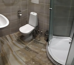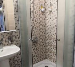 В комнате: двуспальная диван-кровать, телевизор, стол со стулом, вешалка, телефон. Санузел с душевой кабиной, унитаз с функцией биде, фен.