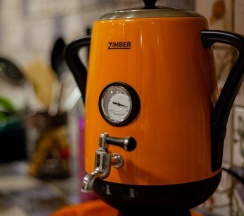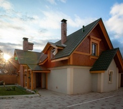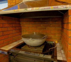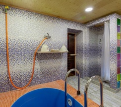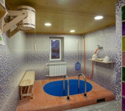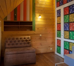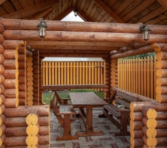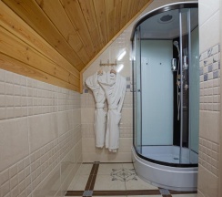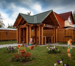 В Домике с Чайной и Баней на Дровах «Месяцок» 4 отдельные комнаты для отдыха, каждая из которых оборудована полным санузлом. Домик рассчитан на комфортное пребывание от 2 до 12 человек. В кухне находится встроенное, специально оборудованное устройство (Гриль-бокс) на дровах для приготовления блюд – гриль, шашлыка и пр., а также плова (в «Пловнице»).