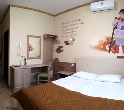 В комнате: семейная кровать с прикроватными тумбочками, телевизор, кондиционер, стол со стулом, вешалка, телефон. Санузел с душевой кабиной, унитаз с функцией биде, фен.
