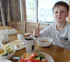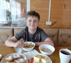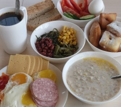 Еда- всё было по домашнему, выбор небольшой но вкусно, каждое утро каши, выпечка, хлеб с маслом, салаты, сыр колбаса, яйца.