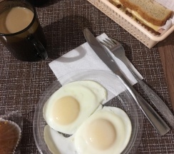 Завтрак входит в стоимость размещения. Мне подали: яичницу, бутерброд с сыром и ветчиной, кофе с молоком, кексик.