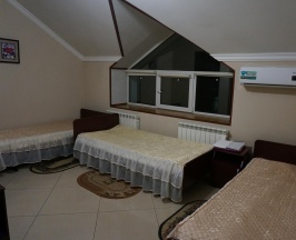 В номере три односпальные кровати, телевизор, холодильник, чайник, душ, туалет.