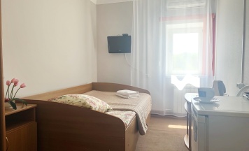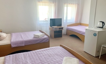 Ночевали в трёхместном улучшенном номере. Все необходимое есть, кровати огромные, белье тактильно приятное, чистое, на каждого по два полотенца, в туалетной комнате зубные щётки, пасты, жидкое мыло, душевая кабина. Приятным бонусом стал завтрак на выбор. Не смотря на не очень хорошие отзывы- завтрак вкусный, куриный бульон настоящий, омлет горячий, блинчики только что приготовленные. Мы ещё и в сауну сходили, она подуставшая, но за эту цену вполне нормально. Администраторы приветливые, обязательно ещё заедем.