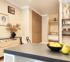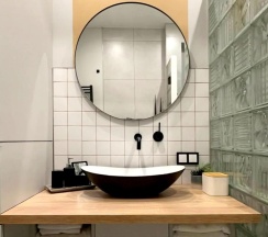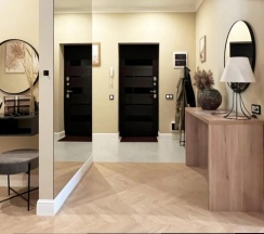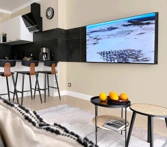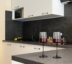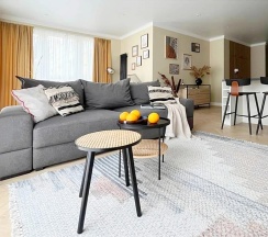 Продуманный современный дизайн, натуральные материалы, высококачественный текстиль оставят приятные впечатления от отдыха. Квартира максимально оснащена современной техникой: большой телевизор с функцией Smart-TV, стиральная машина с функцией сушки, посудомоечная машина, индукционная плита, кофеварка, микроволновка, холодильник, измельчитель отходов, профессиональный фен Yamaguchi, утюг с автоматическим отключением. В спальне широкая кровать с ортопедическим матрасом и мягким изголовьем, а в гостиной удобный диван. По периметру гостиной и в ванной комнате теплые полы. В гостиной и спальне шторы блэкаут.