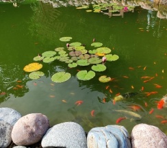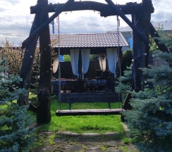 Есть баня, бассейн, места для шашлычков, пруд с рыбками, и качели.