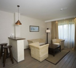 В номере: гостиная с мягкой мебелью, холодильником, телевизором, барной стойкой и большая спальня.