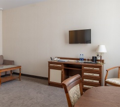 Уютный двухкомнатный номер, состоящий из спальни с 1 двуспальной кроватью, гостиной с мягкой мебелью и ванной комнаты с душевой кабиной, биде и феном. В номере есть чайная станция, холодильник, телевизор в каждой комнате. С лоджии открывается прекрасный вид на Волгу. Проживание с животными запрещено.