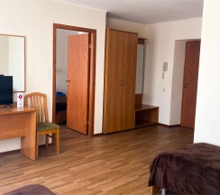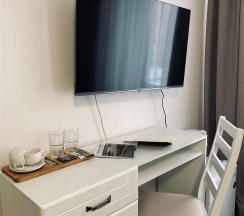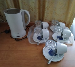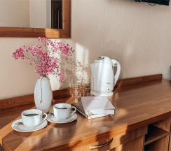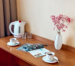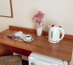 Для комфортного проживания в номере: холодильник, электрический чайник, чайная посуда, фен, телевизор.