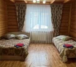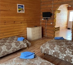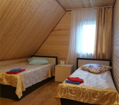 Двухместный номер с двумя полутороспальными кроватями, собственным санузлом, телевизором, чайником, набором посуды. Холодильник и МВП в холле на 4 номера