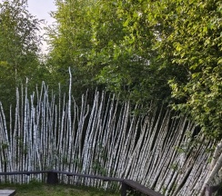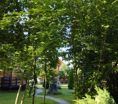 Территория облагорожена, с детскими площадками, мангальными зонами и прикольными фигурками из березовых поленьев.
