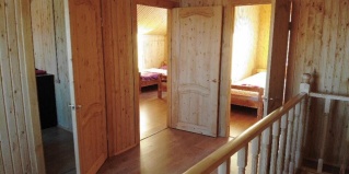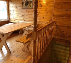 На первом этаже – кухня-гостиная с большим столом для большой компании. На втором этаже- три раздельные спальни, общее количество спальных мест 10, из них три двуспальные кровати, сделанные вручную. Около домов собственные столы, мангалы, решетки, качели и место для отдыха.
