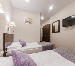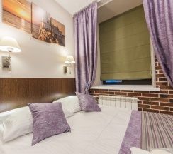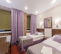 Уютная комната, в которой могут разместиться один или два человека. Площадь 11 кв.м. Интерьер выполнен в спокойной цветовой гамме c мотивами дизайна Лофт, располагает к отдыху после долгих экскурсий, прогулок и развлечений в городе. В комнате предусмотрена вся необходимая мебель: 1-2 кровати по желанию клиента, стол со стульями, комфортная ванная комната и все необходимые туалетные принадлежности