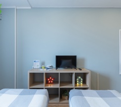 Комната укомплектована двумя кроватями Спринг Бокс с ортопедическим основанием, которые при необходимости трансформируются в двуспальную кровать с матрасом средней жесткости. Так же в комнате имеются две прикроватные тумбы, телевизор с плоским экраном, стеллаж для хранения вещей, открытый гардероб, предметы декора.